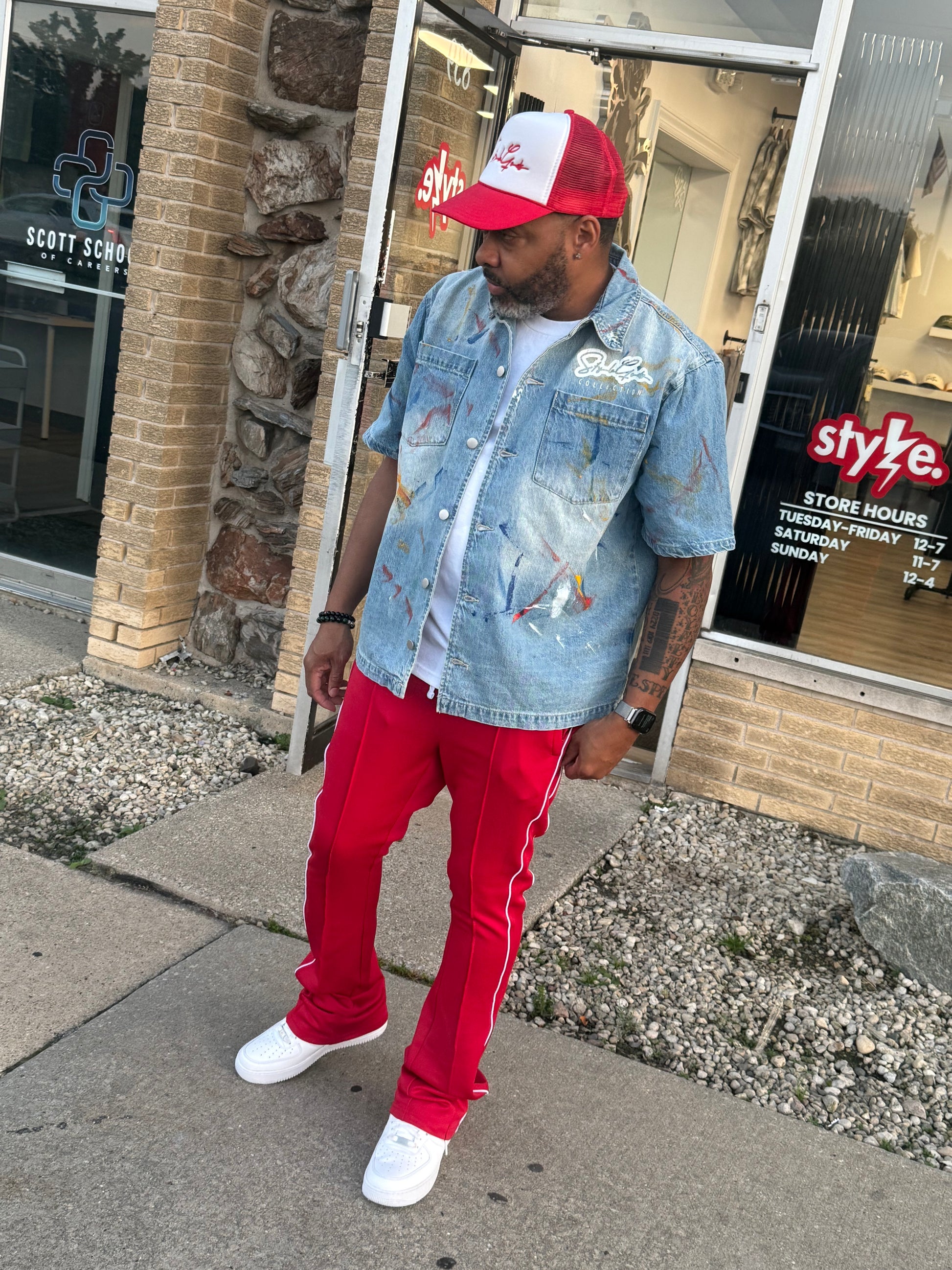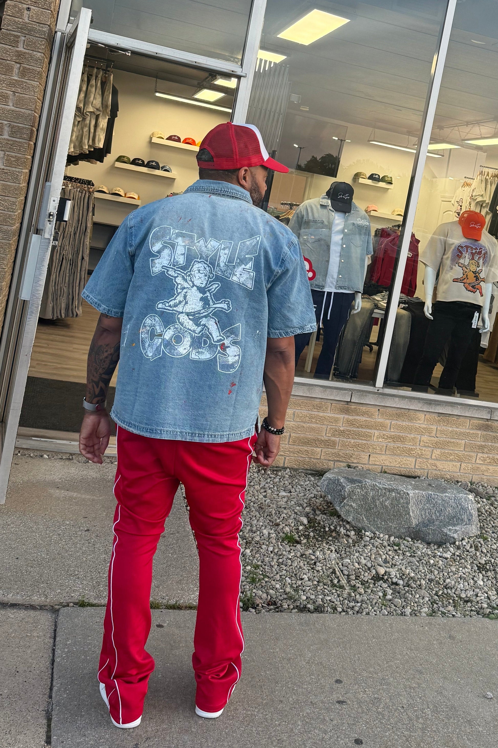 StyleGods Denim Crop Button up Shirt Paint Splatter - Light Blue\Multi